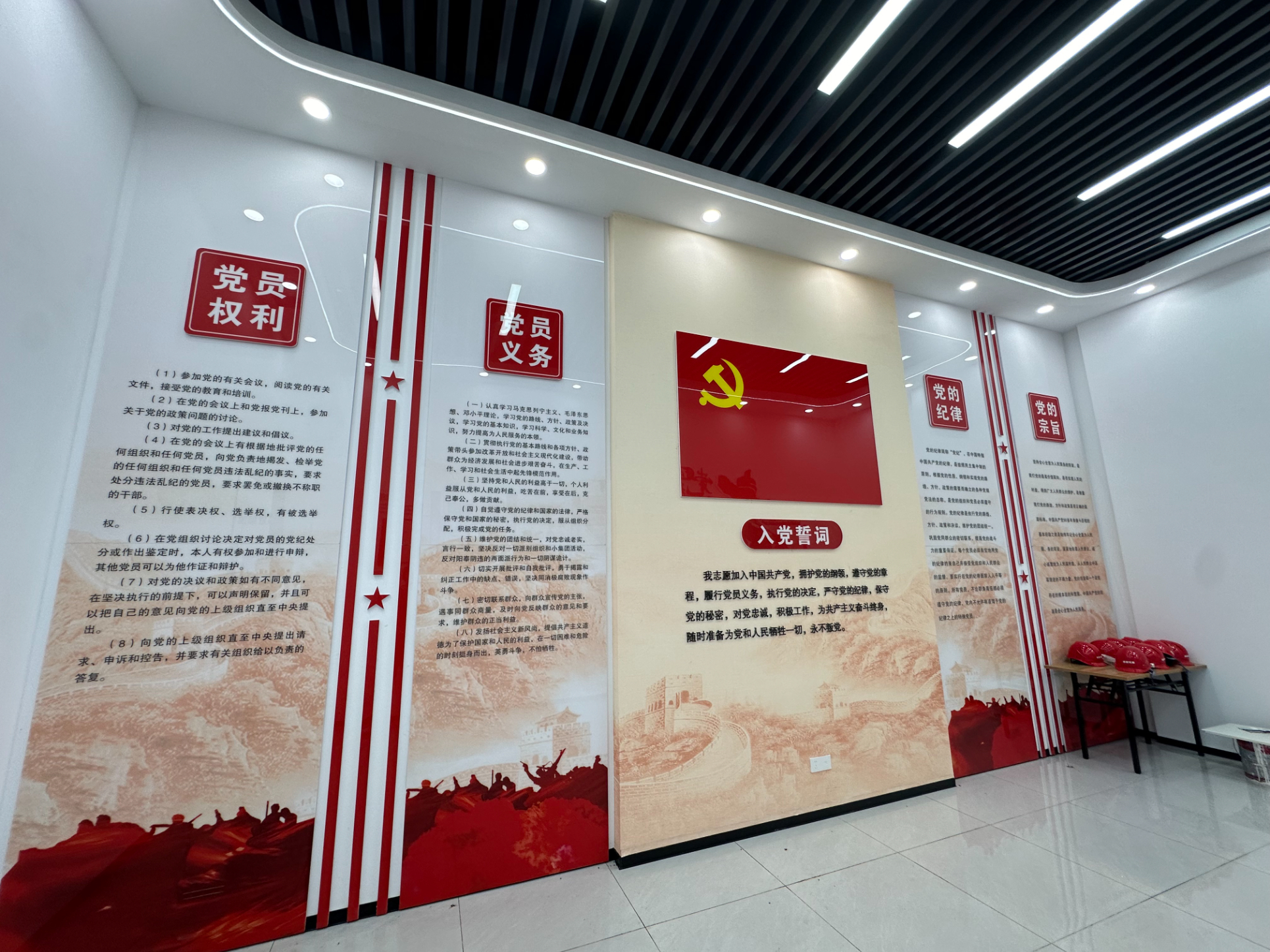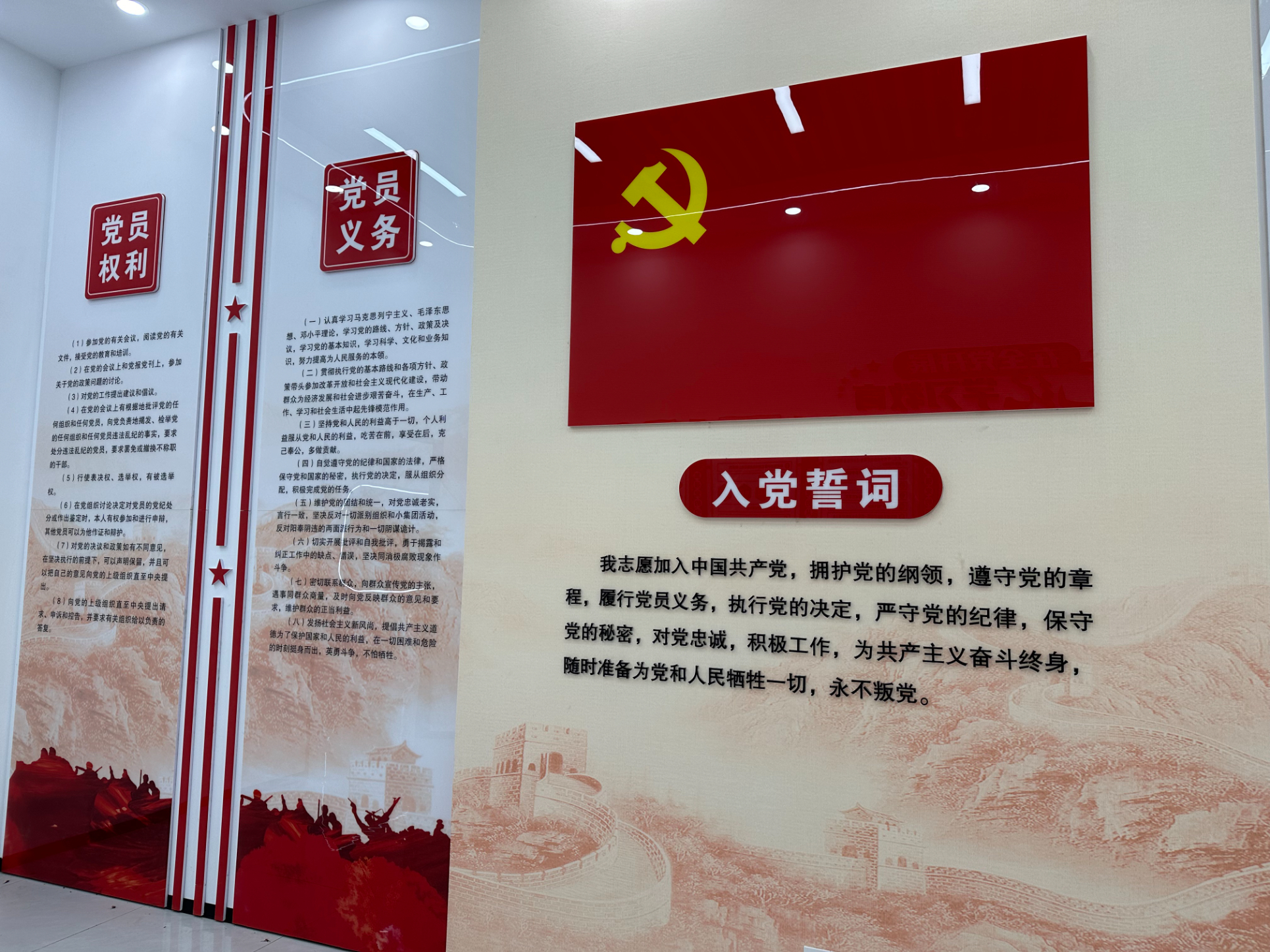 離開(kāi)安全體驗(yàn)區(qū),下一個(gè)功能區(qū)則為十分亮眼的黨建文化區(qū)。大幅的長(zhǎng)城壁畫(huà),振奮人心的入黨誓詞,鮮艷的黨旗,無(wú)不讓參觀者的思想深受黨建文化的熏陶。